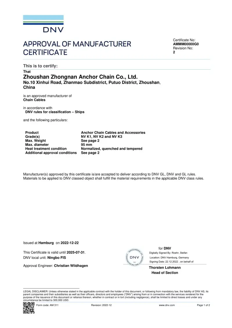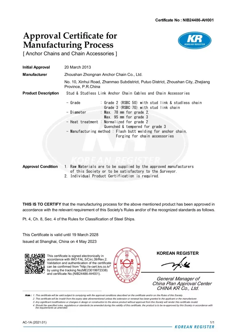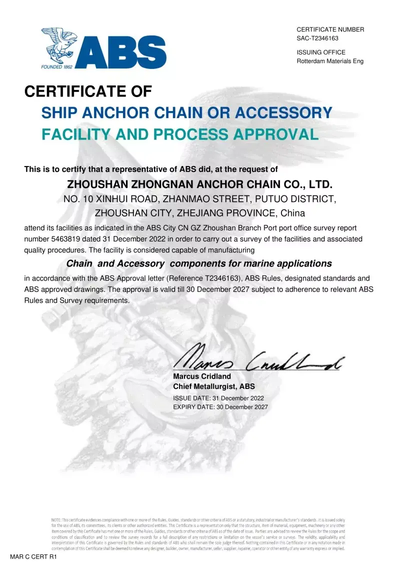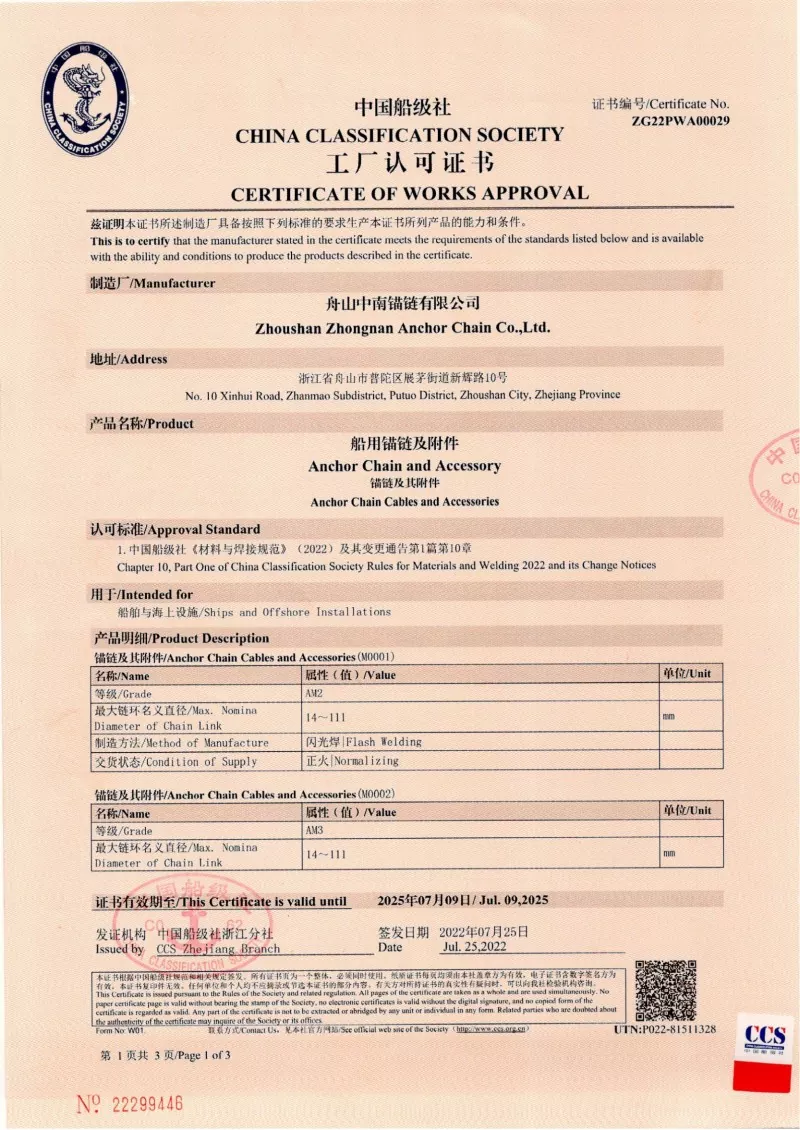 Jokainen tehtaan ankkuriketju on testattu ja tärkeimmät luokitteluyhdistykset sertifioidaan ansaitakseen luottamusta globaalissa mittakaavassa. Merilaitteiden tiukat turvallisuus- ja suoritusstandardit kattavat hyväksynnän, joita voimme tarjota CCS: ltä, ABS: ltä, DNV: ltä, LR: ltä, BV: ltä, NK: ltä, Rina, KR ja Rs.