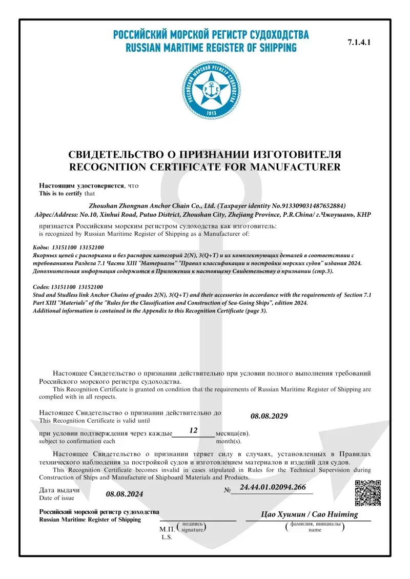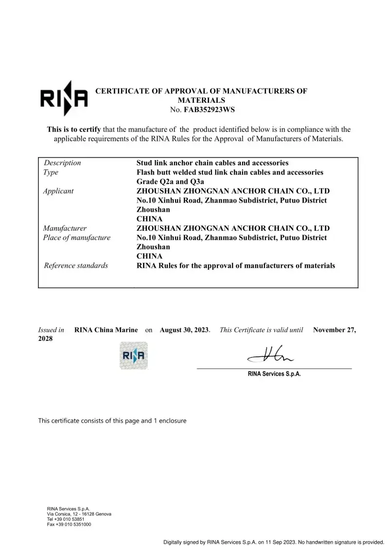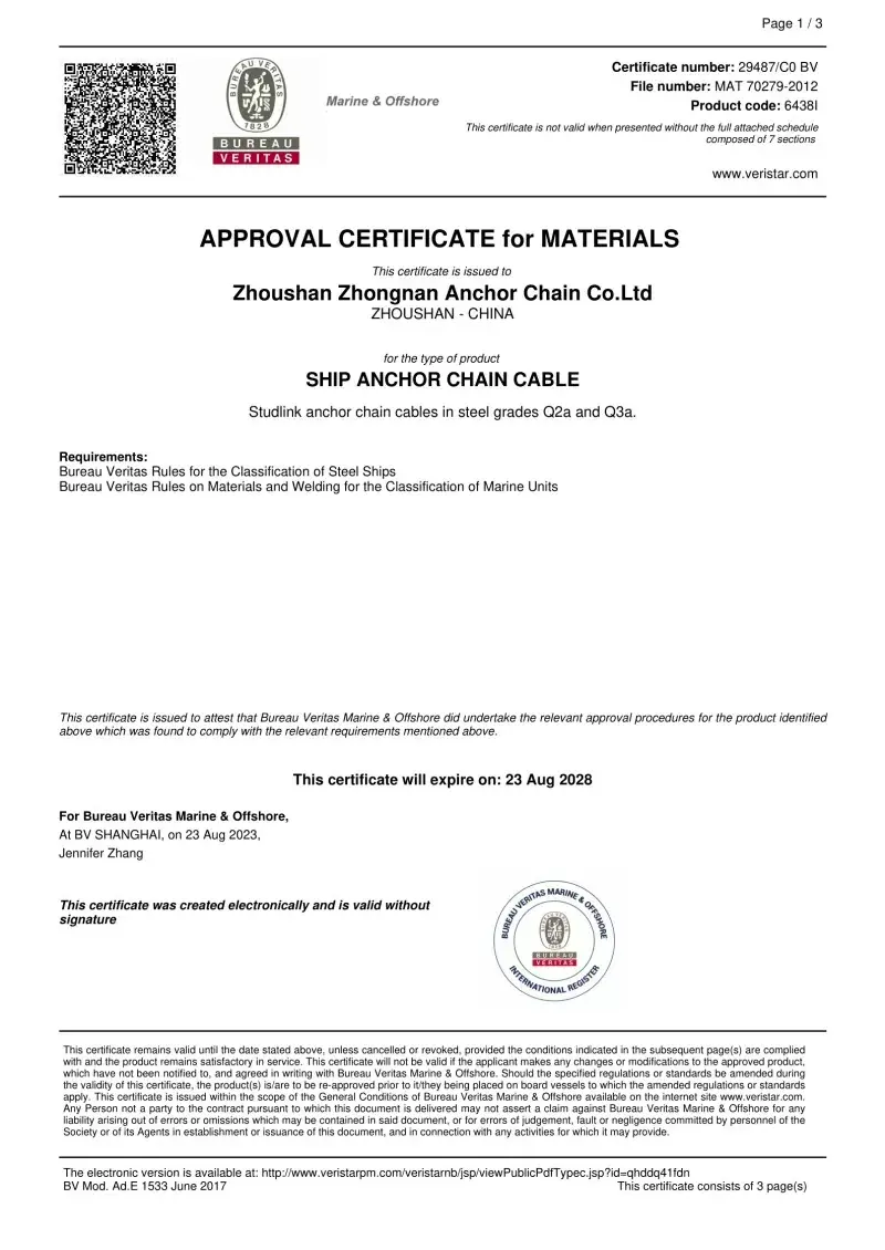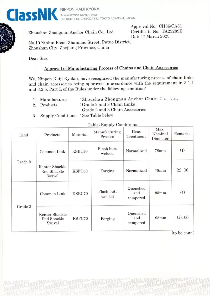 Jokainen tehtaan ankkuriketju on testattu ja tärkeimmät luokitteluyhdistykset sertifioidaan ansaitakseen luottamusta globaalissa mittakaavassa. Merilaitteiden tiukat turvallisuus- ja suoritusstandardit kattavat hyväksynnän, joita voimme tarjota CCS: ltä, ABS: ltä, DNV: ltä, LR: ltä, BV: ltä, NK: ltä, Rina, KR ja Rs.